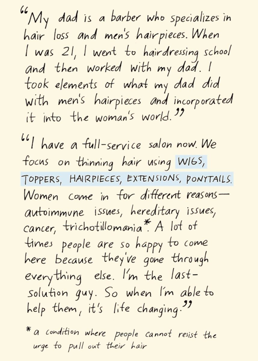 “Women come in for different reasons-autoimmune issues, hereditary issues, cancer, trichotillomania. A lot of times people are so happy to come here because they've gone through everything else. I'm the last-solution guy. So when I'm able to help them, it's life-changing”
